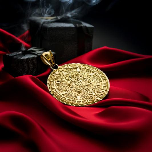 10K Gold Aztec Mayan Sun Calendar Pendant Necklace (yellow, white, rose gold)
