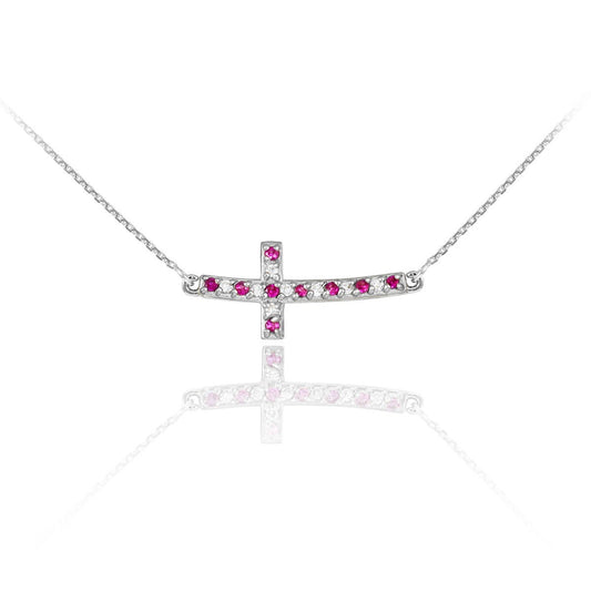 14K Gold Diamond and Ruby Curved Mini Sideways Cross Necklace (yellow, white, rose gold)