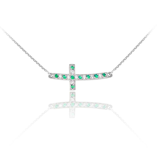 14K Gold Diamond and Emerald Curved Mini Sideways Cross Necklace (yellow, white, rose gold)
