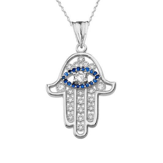 Diamond Studded Gold Hamsa Blue Sapphire Evil Eye Pendant Necklace (10k, 14k, yellow, white, rose gold)