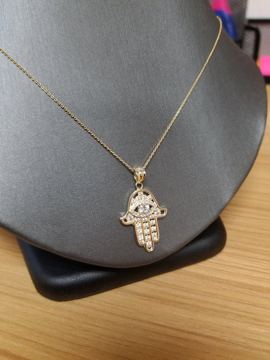 Diamond Studded Gold Hamsa Evil Eye Pendant Necklace (10k, 14k, yellow, white, rose gold)