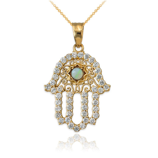 Diamond Studded Gold Filigree White Opal Hamsa Charm Necklace (10k, 14k, yellow, white, rose gold)
