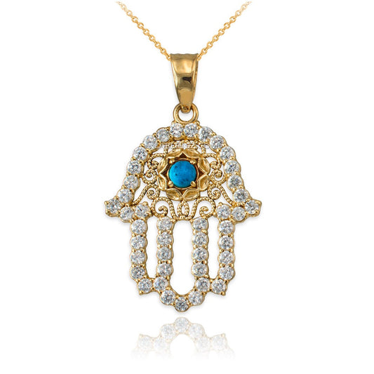 Diamond Studded Gold Filigree Turquoise Hamsa Charm Necklace (10k, 14k, yellow, white, rose gold)