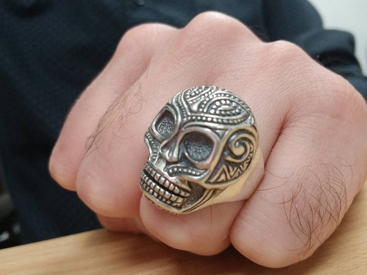 Solid Sterling Silver Sugar Skull Santa Muerte Mens Statement Ring
