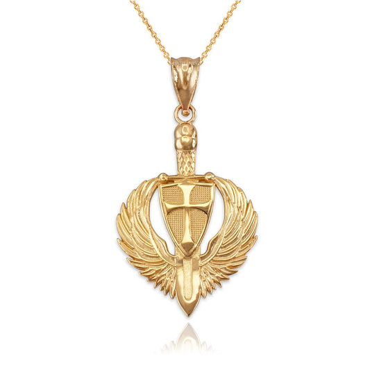 Gold Crusader Winged Sword and Shield Pendant Necklace (10K, 14K, yellow, white, rose gold)