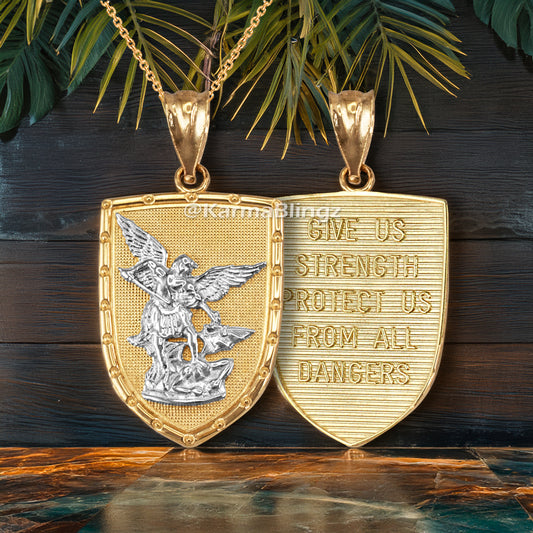 Gold St. Michael Shield Pendant Protection Charm Necklace (yellow, white, rose, 2-tone, 10K, 14K)