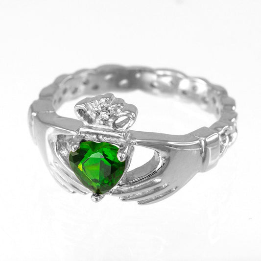 Silver Irish Claddagh Ring - Emerald Green CZ Birthstone Ring - Celtic Band Claddagh Ring