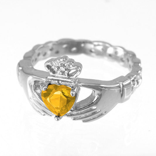 Silver Claddagh Ring - Citrine Yellow CZ Birthstone Ring - Celtic Band Irish Claddagh Ring