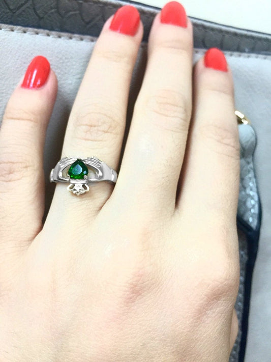 White Gold Irish Claddagh Ring - Emerald Green CZ Heart Birthstone Diamond Ring - Celtic Band Claddagh Ring