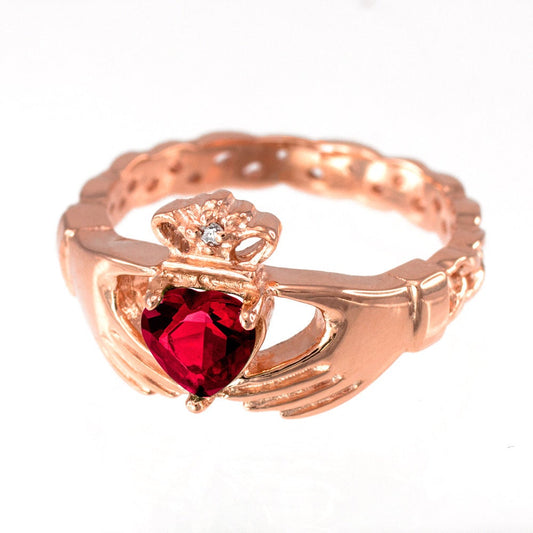 Rose Gold Claddagh Ring - Ruby Red CZ Birthstone Diamond Ring - Celtic Band Claddagh Ring