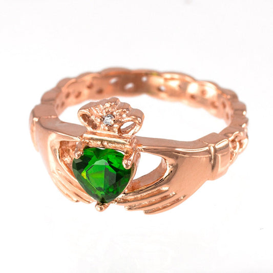 Rose Gold Claddagh Ring - Emerald Green CZ Heart Birthstone Diamond Ring - Celtic Band Claddagh Ring