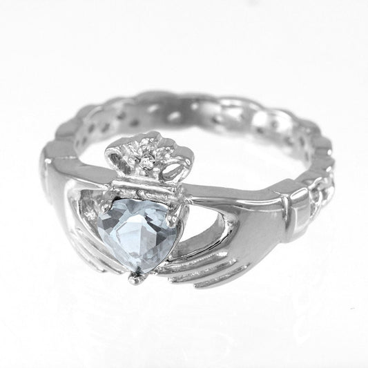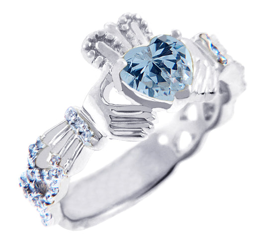 White Gold Irish Claddagh Ring - Aquamarine CZ Birthstone Diamond Ring - Celtic Band Claddagh Ring