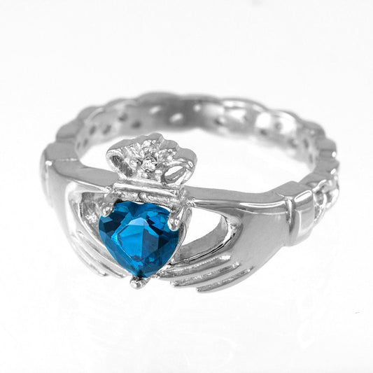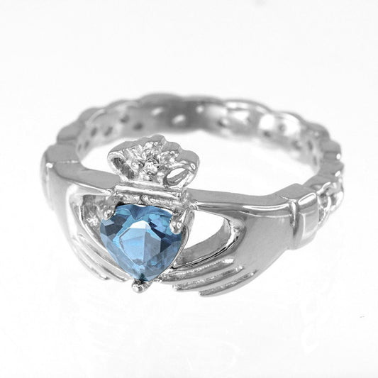 Silver Claddagh Ring - Blue Topaz CZ Birthstone Ring - Celtic Band Irish Claddagh Ring