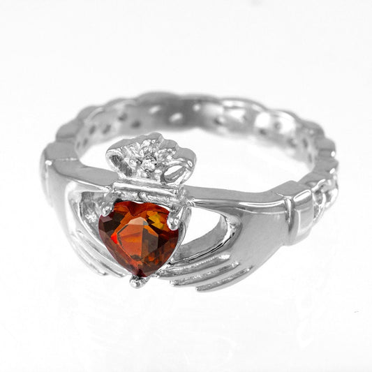 Silver Claddagh Ring - Garnet CZ Birthstone Ring - Celtic Band Claddagh Ring
