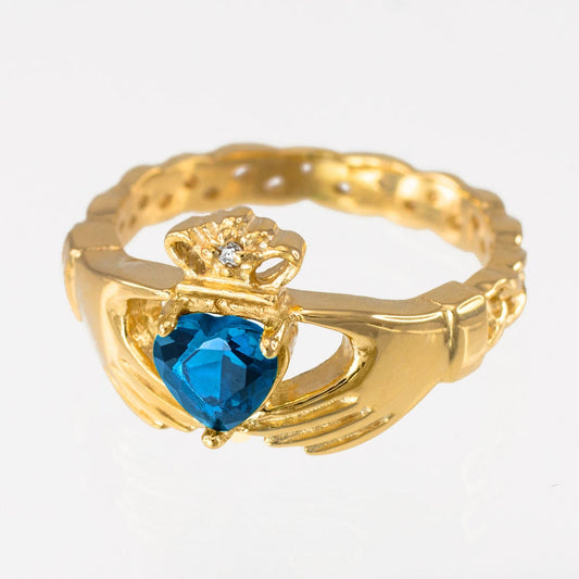 Gold Claddagh Ring - Blue Topaz CZ Birthstone Diamond Ring - Celtic Band Claddagh Ring