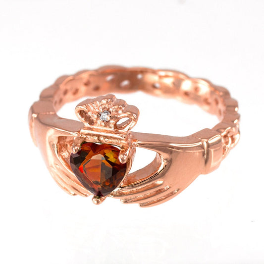 Rose Gold Claddagh Ring - Garnet CZ Birthstone Diamond Ring - Celtic Band Gold Claddagh Ring