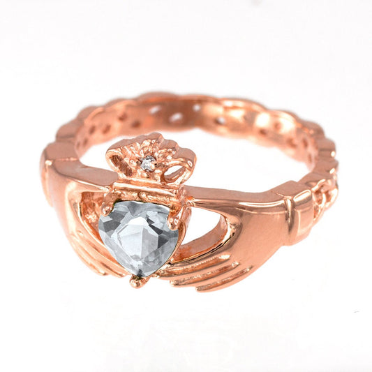Rose Gold Irish Claddagh Ring - Clear CZ Heart Birthstone Diamond Ring - Celtic Band Claddagh Ring