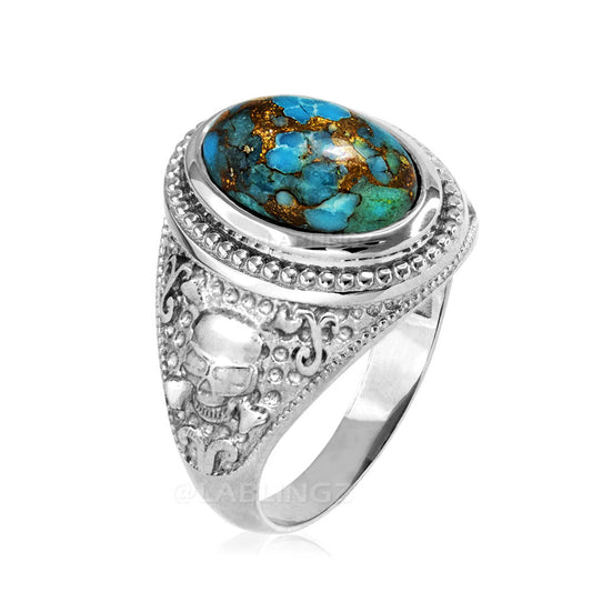 Sterling Silver Blue Copper Turquoise Skull And Bone Biker Gemstone Ring.