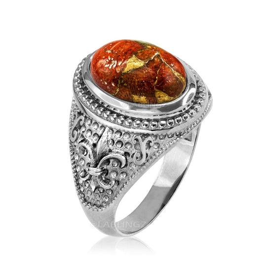 Sterling Silver Fleur De Lis Orange Copper Turquoise Ring