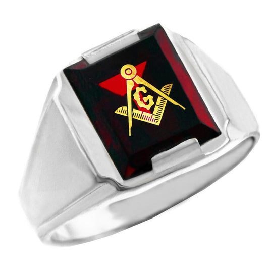 Sterling Silver Freemason Mens Red CZ Square & Compass Masonic Ring