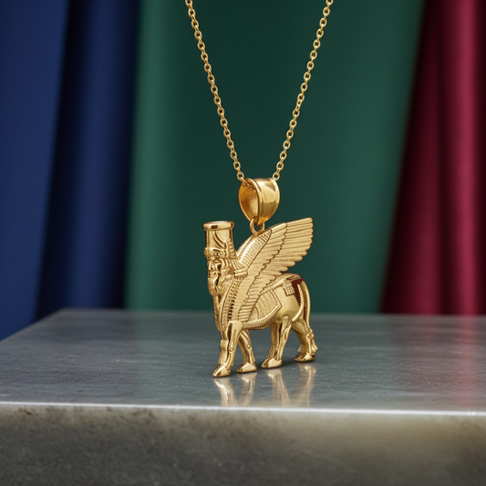 Gold Ancient Assyrian God Lamassu Winged Bull Pendant Necklace (yellow/white/rose)