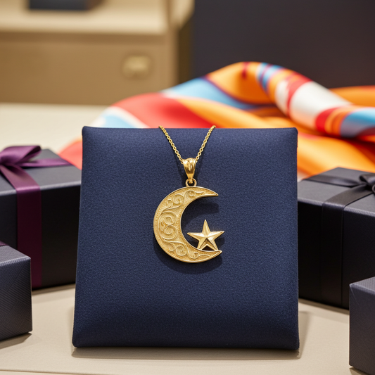 Gold Islamic Crescent Moon Pendant Necklace (yellow, white, rose gold, 10k, 14k)