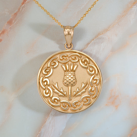 Gold Scottish Thistle Medallion Pendant Necklace (10k, 14k, yellow, white, rose gold)
