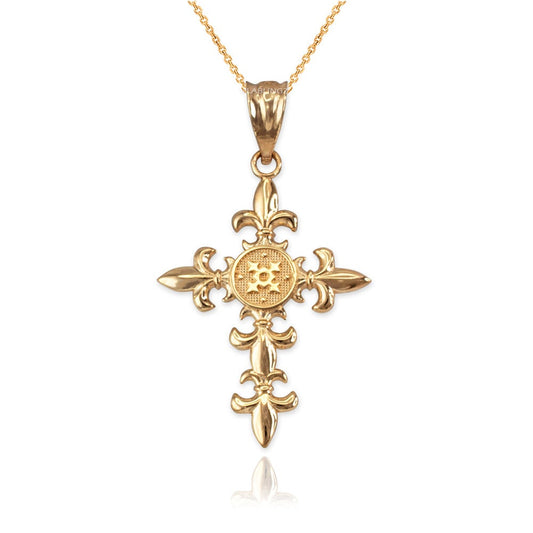 Polished Gold Fleur de Lis Cross Pendant Necklace (10K, 14K, yellow, white, rose gold)