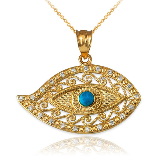 Gold Filigree Turquoise Evil Eye Diamond Pendant Necklace (10k, 14k, yellow, white, rose gold)