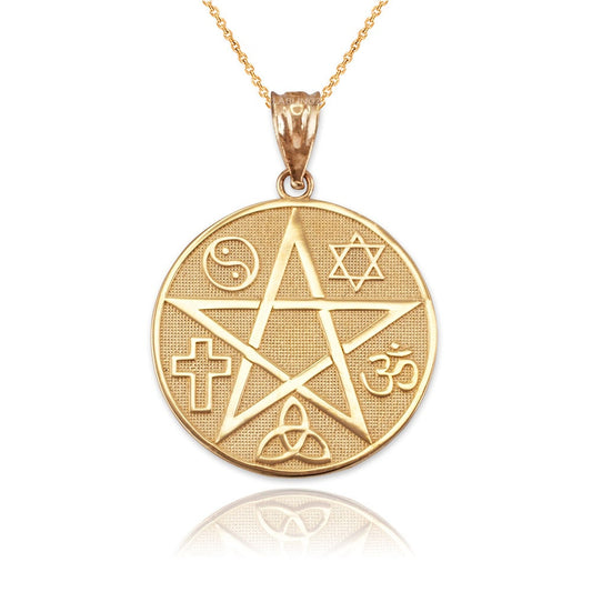 Gold Multicultural Pentacle Medallion Pendant Necklace (10K, 14K, yellow, white, rose gold)