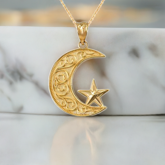 Gold Islamic Crescent Moon Pendant Necklace (yellow, white, rose gold, 10k, 14k)