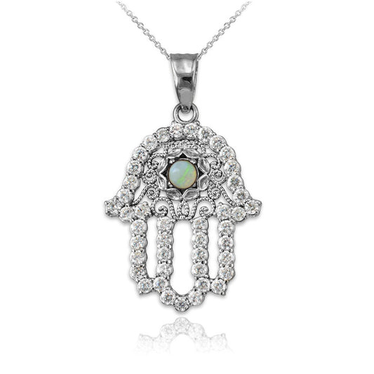 Sterling Silver Filigree Hamsa White Opal CZ Charm Necklace