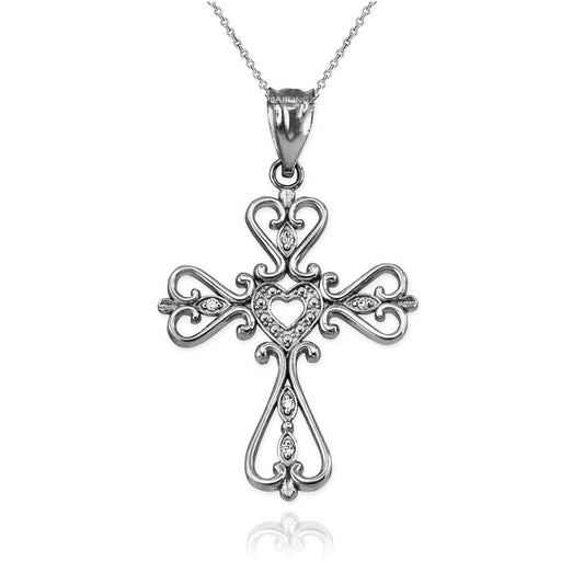 Sterling Silver Open Heart CZ Cross Pendant Necklace