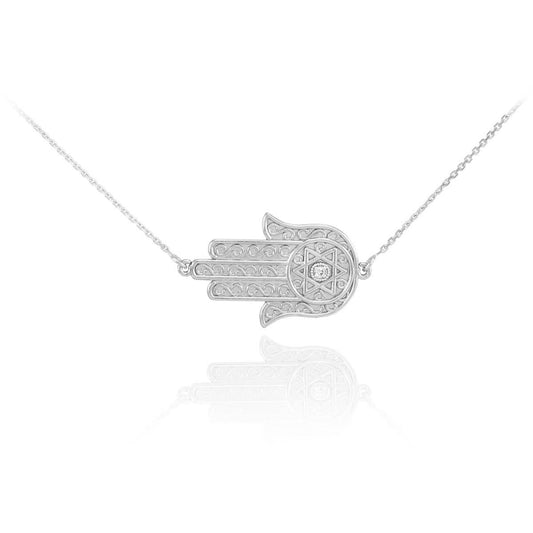 14K Gold Sideways Hamsa Star of David Diamond Necklace (yellow, white, rose gold)