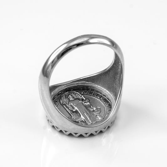 White Gold Saint Benedict Medallion Womens Ring