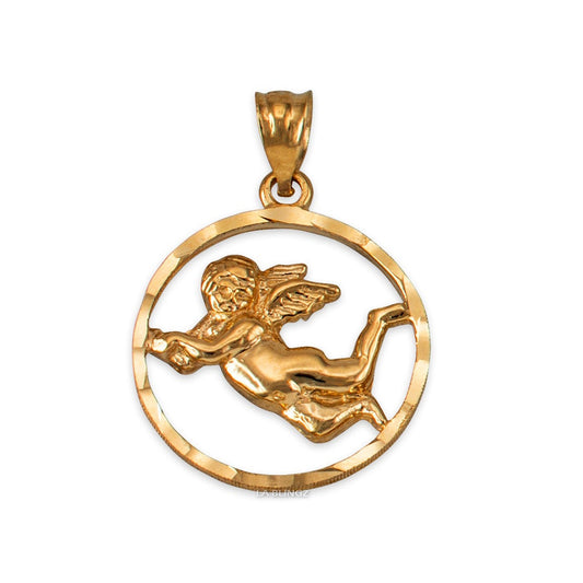 Gold Flying Angel Round DC Pendant Necklace (10K, 14K, yellow, white, rose gold)