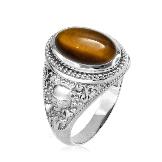 Sterling Silver Tiger Eye Skull And Bone Biker Gemstone Ring.