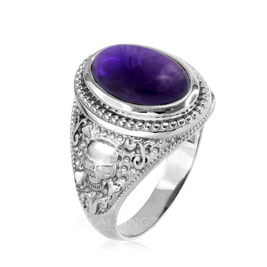 Sterling Silver Purple Amethyst Skull And Bone Biker Birthstone Ring.
