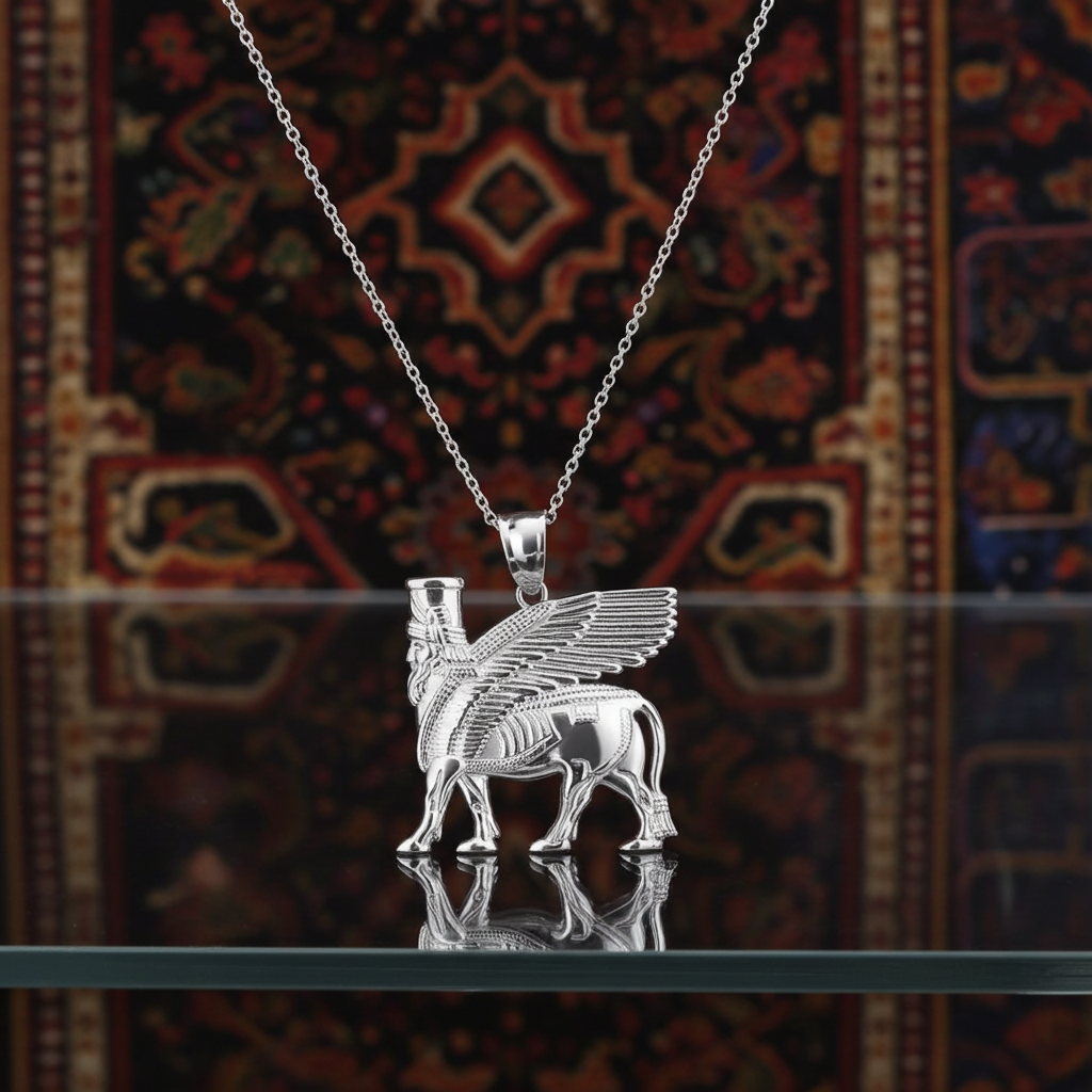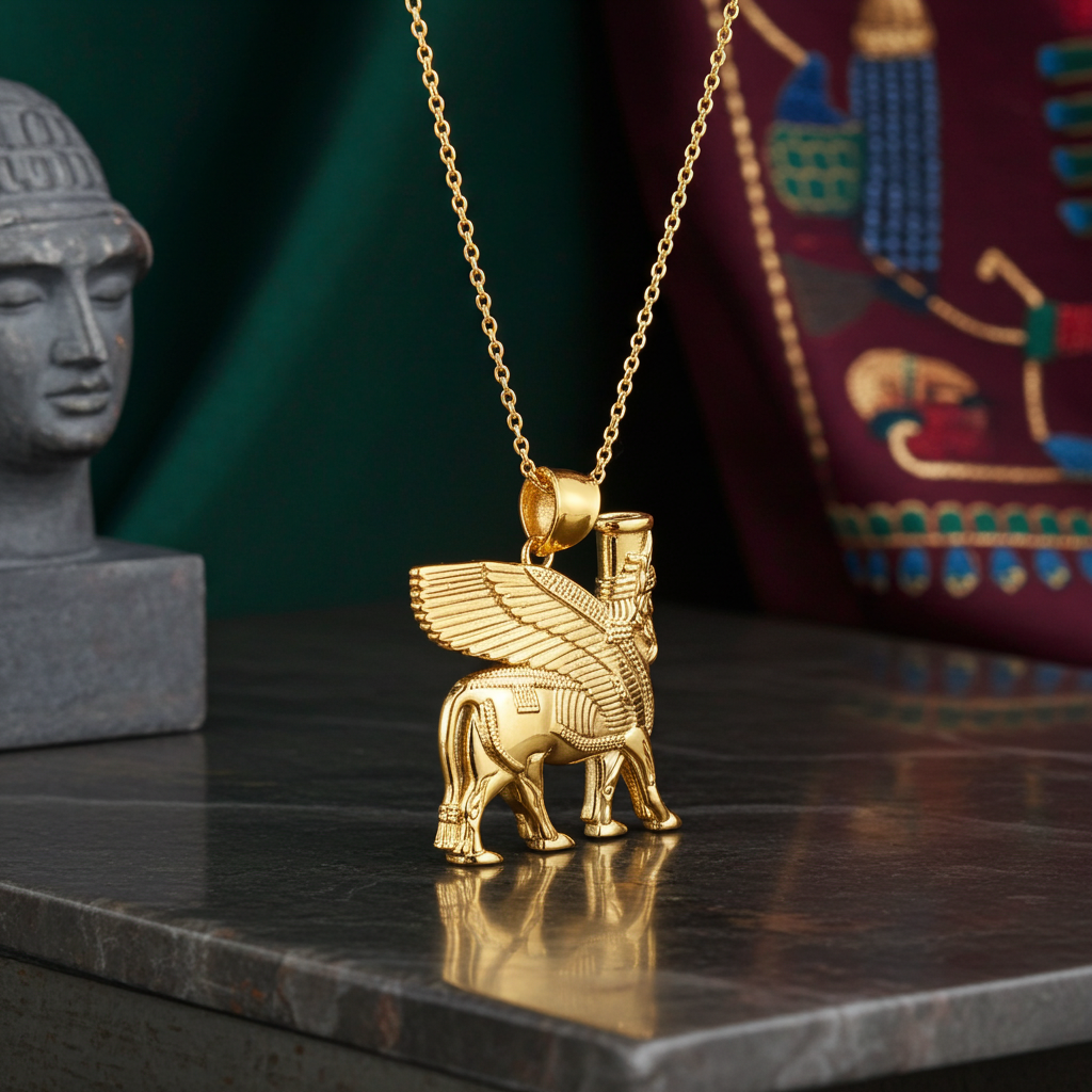 Unveil the mystique of ancient Assyria with the Gold Ancient Assyrian God Lamassu Winged Bull Pendant Necklace. This unique piece features the powerful Lamassu, a mythical deity symbolizing protection and strength. Crafted from high-quality gold, this pendant necklace is perfect for those who appreciate historical and cultural significance in their jewelry.