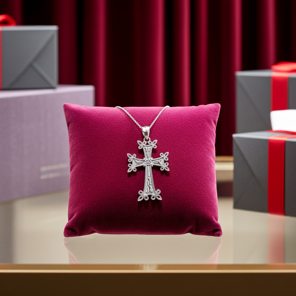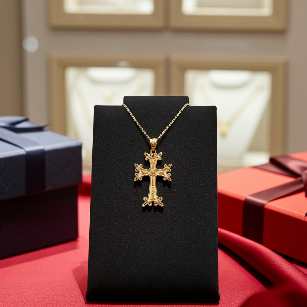 The Gold Armenian Reversible Cross Pendant Necklace is a striking representation of faith, tradition, and heritage. Available in yellow, white, and rose gold, and offered in both 10K and 14K gold options, this pendant features a unique reversible design, allowing the wearer to showcase different sides for various symbolic meanings. Rooted in Armenian Christian history, the cross is a powerful symbol of protection and spirituality, ideal for daily wear or as a meaningful gift. Handcrafted with exceptional detail, this cross pendant reflects the beauty and depth of Armenian culture while making a versatile and stylish accessory. Engraved text on reverse side means Save & Protect.
